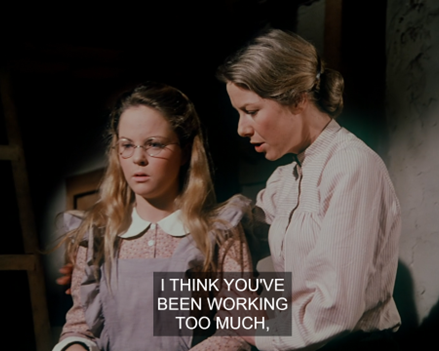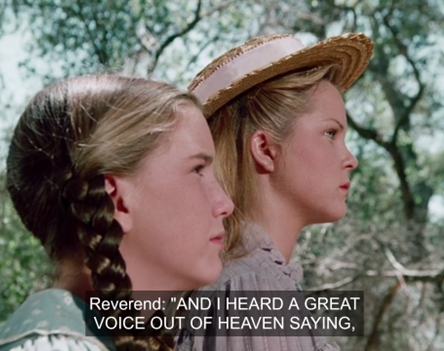 I tried to see if I could think of moments when we hear Laura’s theme, and maybe I should be embarrassed, but I can think of a few: in the Lord Is My Shepherd, Laura’s theme plays right after she finishes her first prayer on the rock up on Borgnine’s Mountain. At the end of My Ellen, we get a quick snatch of Laura’s theme when she appears back in braids, bringing the book to Busby. In Fagin, amid the montage with crazy Albert theme, we get melancholy Laura theme when we see her at the barn door. (We hear the the two themes close together again in Look Back to Yesterday, right after the silliness with Jason’s kiss on the mountain top). My favorite use of Laura’s theme is in A Christmas They Never Forgot, when the choir voices actually hum it during Laura’s flashback. It proves they hired singers instead of using stock Christmas songs.