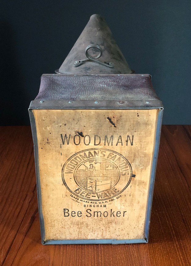 There’s also a funnel-topped tin canister next to what looks like a little accordion. This is a smoker. You burn material such as pine needles, mushrooms, etc., and the bellows pump the smoke through the funnel into the hive, smoke being known since antiquity to calm bees. (This specific device was invented in 1873.)