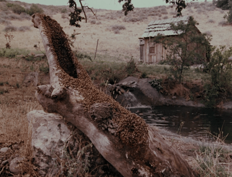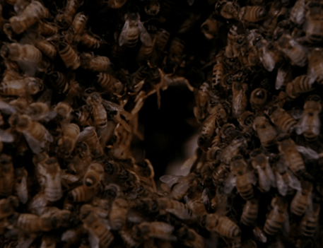 Tremulous “beehive” music brings us into a shot of, well, a beehive.