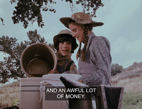 In the barn, despite Pa having done everything short of branding his children on the arm with CASH ON THE BARREL, Laura and Al are already spending their money.