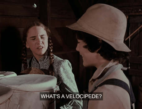 Laura doesn’t know what a velocipede is, which seems unlikely to me. Willie Oleson knew what one was in Season One, and he was like four years old.