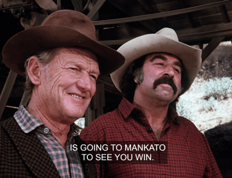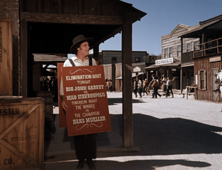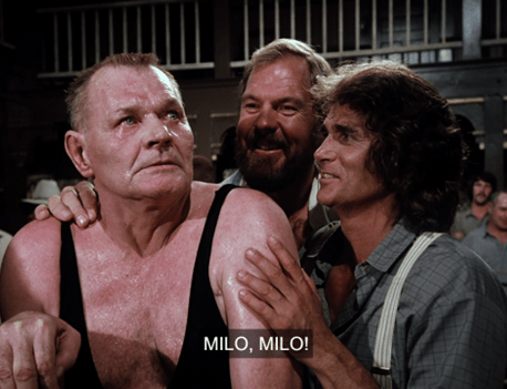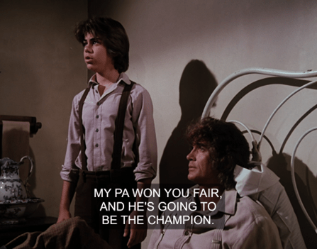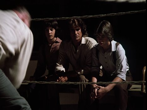 1. You know, that’s a really interesting observation: that boxing is an inherently brutal sport, one in which the object is literally for the contestants to beat each other senseless, whereas wrestling is a demonstration of strength with strict rules and a “pure” lineage to classical Athenian ideals, which of course also included philosophy and democracy. Ancient Greece is, or was in the Twentieth Century, often portrayed as a more civilized counterpart to Rome, with the latter’s decadence, violence, and “bread and circuses.” Hans Mueller, of course, is not Roman but German, but remember, in the 1970s most Americans still associated Germany with the atrocities and (literally) overkill of only a few decades past. (Little House the TV show is actually closer to WWII than it is to our time by about ten years.) But never mind that. Mueller certainly approaches fighting like a Roman gladiator, not a wrestler, with his gluttony, drunkenness and barbarity. (Consider his repulsive pleasure when he anticipates crippling Garvey. Jack Yates milks a lot out of what could have been a one-note bit part; he plays Mueller not as a dumb brute but as a self-indulgent sadist.) Milo, on the other hand, is portrayed as fundamentally noble, a ruined yet decent-hearted aristocrat in exile, to whom honor and the dignity of playing by the rules still mean something. (He even compares himself to Sleeping Beauty’s prince in the opening scene.)