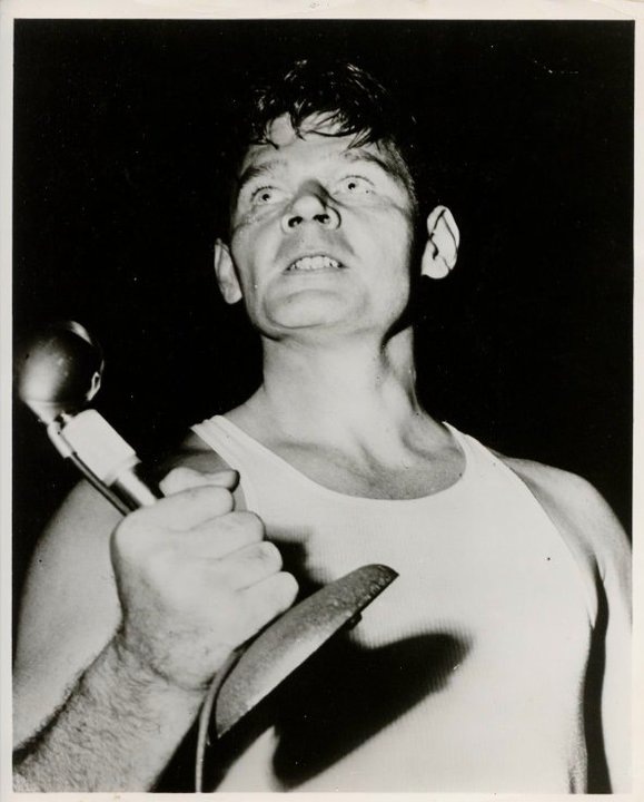 Hans Mueller stands in the ring in an odd trench-coat-style robe. Looks more Inspector Gadget than . . . “Macho Man” Randy Savage? (I’m sorry, I really don’t know any wrestlers from after those days.)