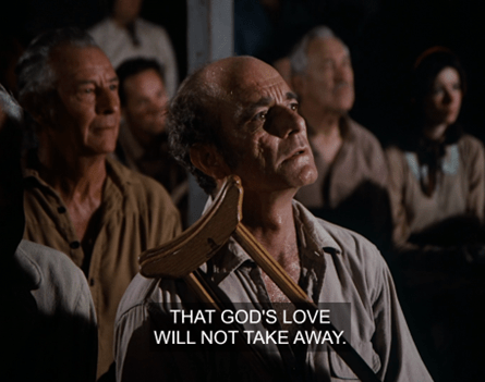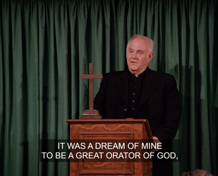 Aldi says that, like his parishioners, he expected more out of life too, but he guesses they’re stuck with each other. (Paraphrase.)