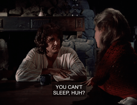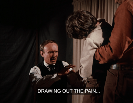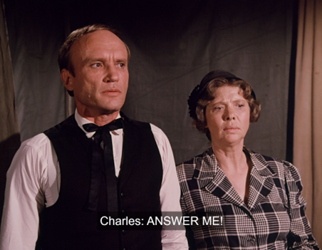 Charles then swings the crutch at the Fake Blind Woman (she’s Carol Norton) and she flinches away, which would be more surprising if he wasn’t also screaming into her face as he did it.
