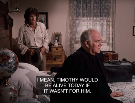 I’ve often wondered if Michael Landon had some beef in his personal life that he chose to uncover, like he did with the media in Harriet’s Happenings. Or maybe he just likes his soapbox.