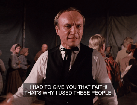 Danforth tries his best to reel them back in. He says yes, the healings were a gimmick, but it was just to bring them to salvation.