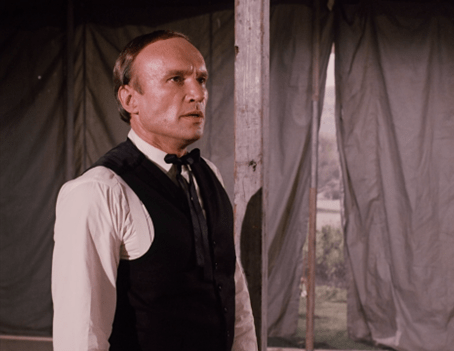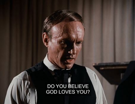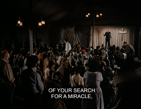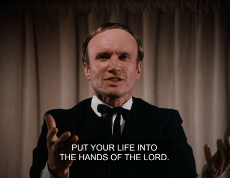 One interesting about Rev. Danforth is that in a lot of stories these fake religious leaders are revealed to be complete hypocrites who never believed a word of what they preach, and there’ll be one scene that makes it clear that their speech and religious persona are all part of an act. But we never see Danforth outside of his faith healer persona, as he always appears as a genuine preacher man who seems completely secure of his ideas. Even when he’s exposed and tries to explain his lies, we don’t see him throw out the “act”, which makes me wonder… what if he believes his own lies?! Maybe he genuinely believes he’s bringing hope and faith to those who believe him and that deep down, there’s actual miracles in his speech, in spite of the fake miracle act he has to make in order to convince him. I watched Night of the Hunter, where John Mitchum plays Harry Powell, an alleged preacher with a twisted view of Christianity and women who uses his persona to approach widows and murder them for their money, and even though it’s not even clear whether or not he’s an actual preacher, he never stops acting like one even when he’s alone, and sometimes even talks to God like He’s by his side and condoning his actions, implying he genuinely believes his religious speech. Danforth’s character reminded me of him, even if he’s not nearly as directly dangerous as Powell.