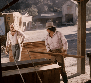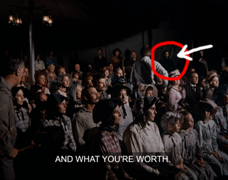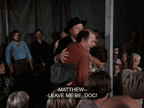 Oddly, in the audience are the Very Upset-Looking Older Man and Doc Holliday as Played By Val Kilmer, who were also in attendance in Walnut Grove, and they don’t seem to recognize the fraudsters. (I suppose they could be drunk, then, or now, or both.)
