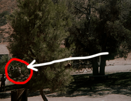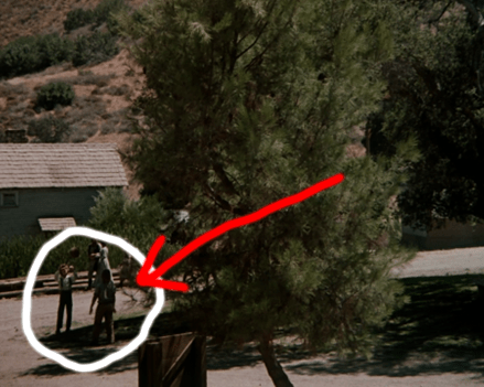 In addition to the Not-Libertini family and the unknown man (the latter of whom – Almanzo? – suddenly veers north in his buckboard), there are six or seven people milling about, not by the Mill uh huh huh, but down where the road leads into town from the south. (Or “Southgate,” as I may decide to call this area at some future time.)