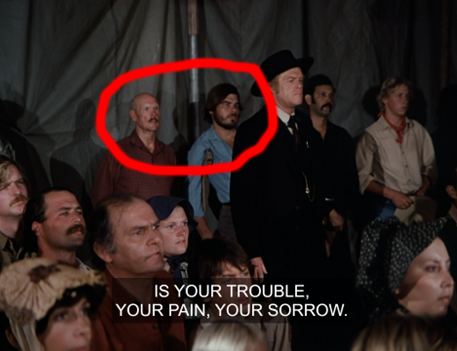 In a shot that anticipates our first glimpse of Mommy Fortuna’s Midnight Carnival in The Last Unicorn, the wagon turns slightly, and we can see it bears a sign reading Divine Church of Salvation, Rev. Jacob Danforth.