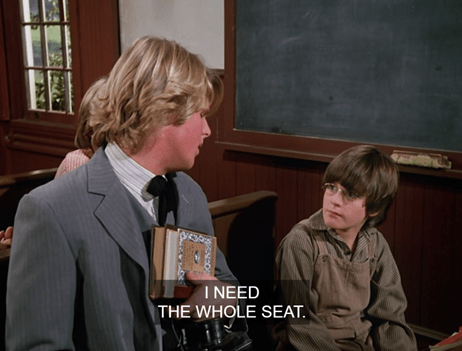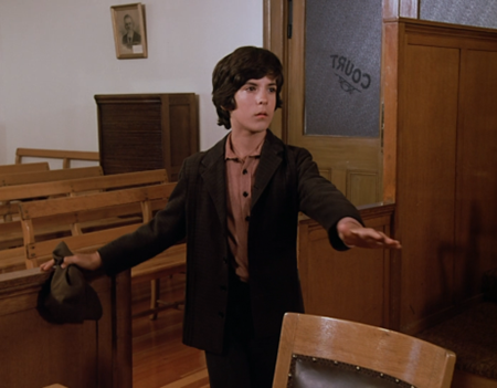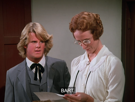 Willie leaps up to offer Bart his seat. (Does he sense Bart is evil and idolize him instinctively, or is he simply trying to keep a fight from breaking out? You’d think it would be the former; but the Oleson kids are growing up this season.)