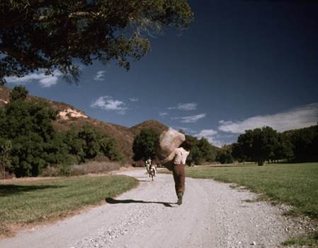 Albert picks up the papier-mâché boulder and holds it, Atlas-style, above the squirming Bart. (I guess it was artistic and practical.)