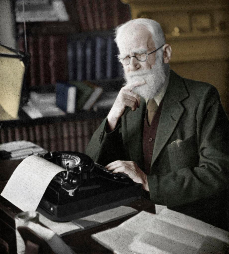 He has a lion-like mane of hair and is dressed in a suit.