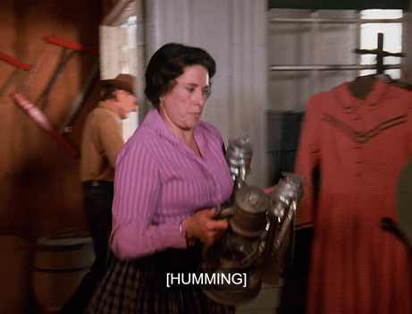 She’s singing “Beautiful Dreamer” (Toby Noe’s love theme) to herself as she sets out the merchandise.