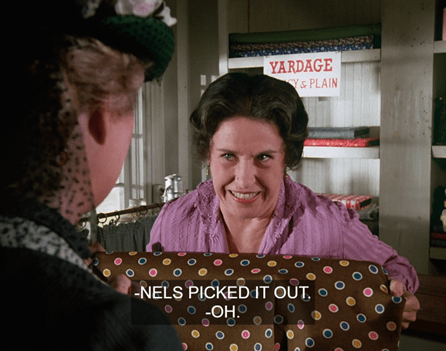Mrs. Oleson laughs in agreement, saying Nels picked it out and should be shot for it. (Paraphrase.)