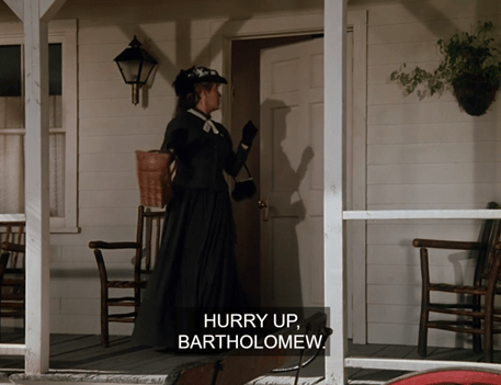 A rather expensively-dressed woman comes out from the house, followed by a man of about twenty whom she addresses as “Bartholomew.”