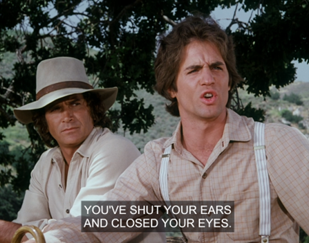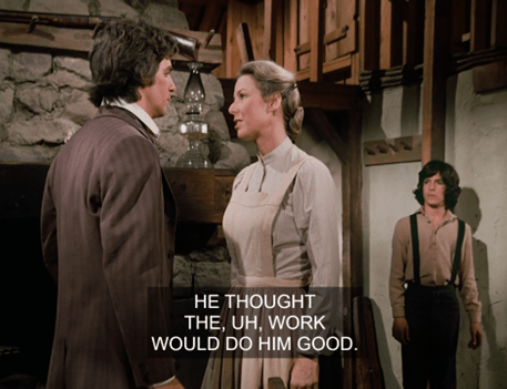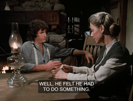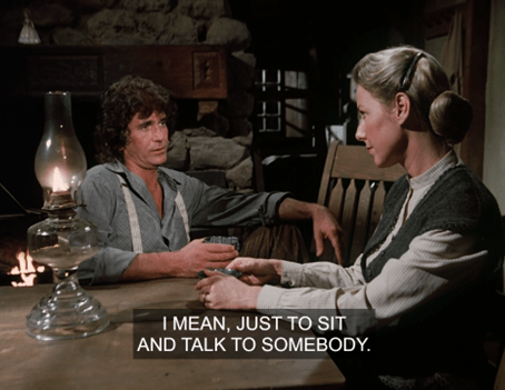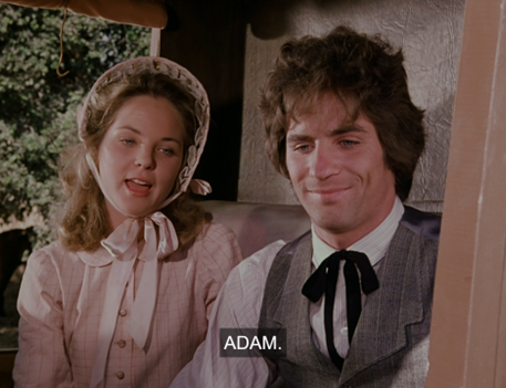 I love that idea. You know, Adam coming from a different social class than everybody else is rarely acknowledged on this show, though he does have a big-city edge and mean streak. (“Why don’t you just say it!”) Just this morning (before the news broke), Dags and I were fantasizing about how the Grovester men should go on a woodland retreat where they all bare their souls and cut loose. (e.g. Nels would get drunk and cry about the Irish woman, Garvey would do a polar plunge in a frozen lake, Doc would come out to his friends, Charles would have one drink, etc.) We imagined that Adam and Manly would get into an argument because Adam is disgusted by how he jerks Laura around. It wouldn’t come to a physical fight, though, since Mr. Edwards would unexpectedly show up and everybody would be happy again. (They’d hear him singing as he neared the cabin.)