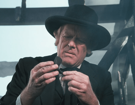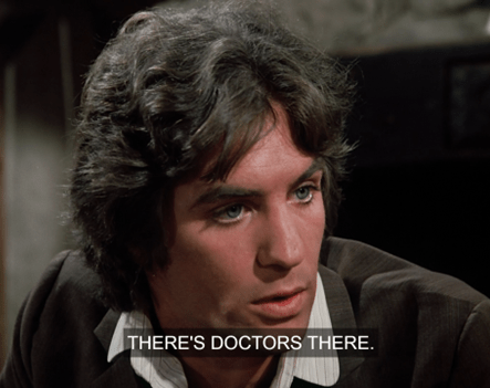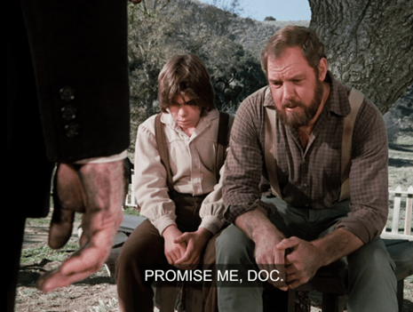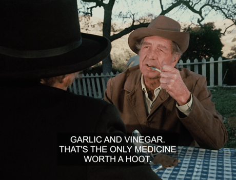 The old man, who’s smoking a pipe, is haranguing Doc about folk remedies, saying “garlic and vinegar” is “the only medicine worth a hoot.”