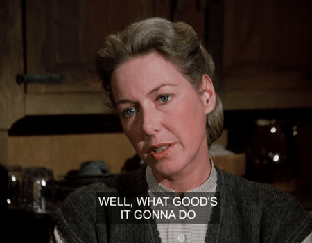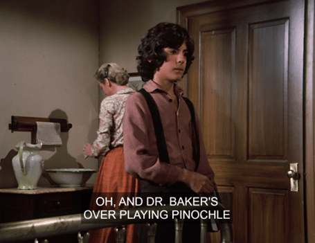 Ma breezes through necessary info about supper and the like, noting that “Doctor Baker’s over playing pinochle at the Feed and Seed with Mr. Dawson if you need him.”