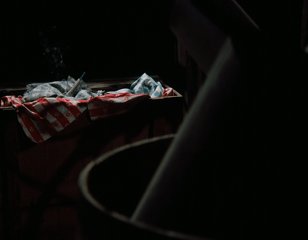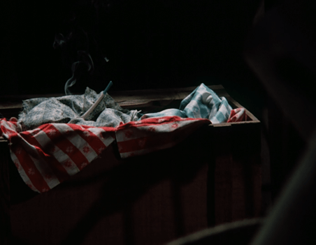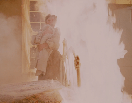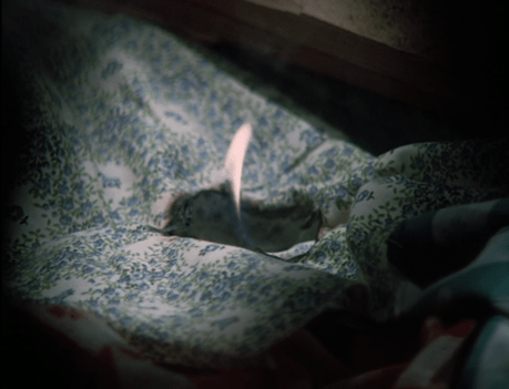 And now we see that the clay pipe, tossed carelessly amongst some tablecloths and what appears to be one of Laura’s old bonnets, is still smoldering.