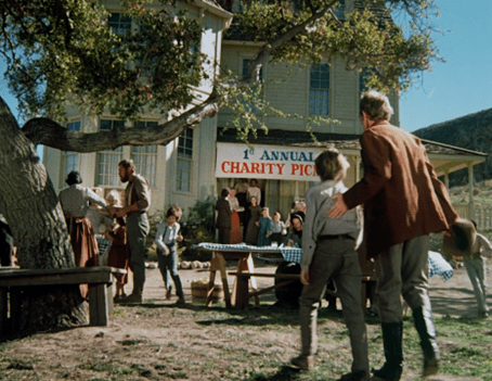 A banner on the building indicates this is the “first annual charity picnic,” even though by my count it’s been fifteen years in Little House Universal Time (LHUT) since the school came to Walnut Grove.