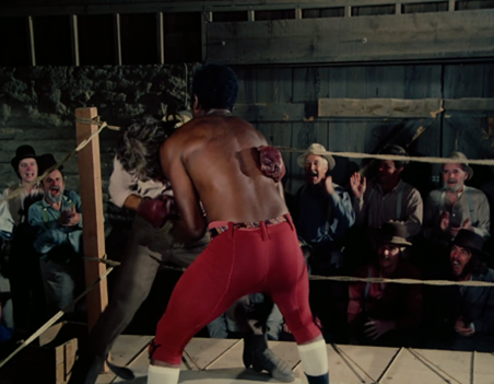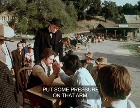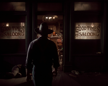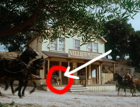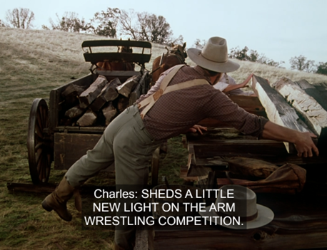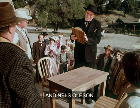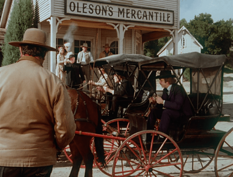 Rev. Alden fires a gun (!), and off they go, west out of town past the Feed & Seed – which is where they’re doing the arm-wrestling.