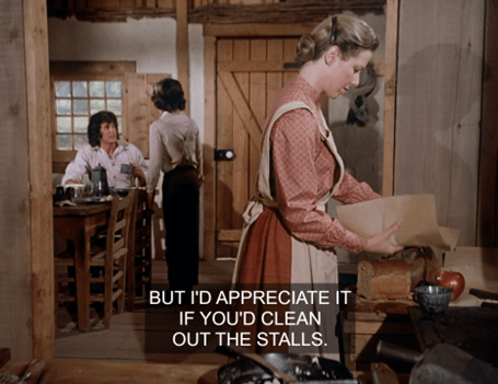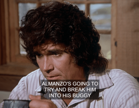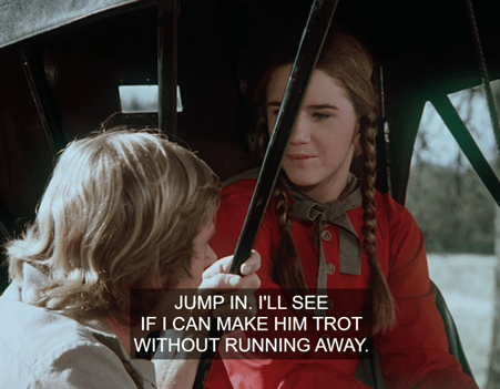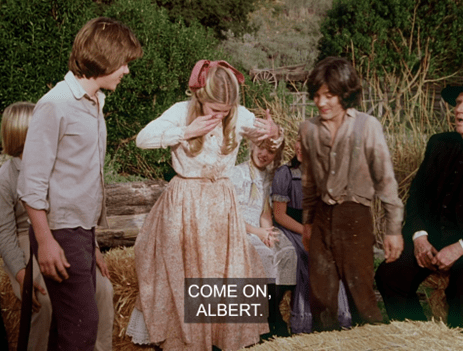 I know, far too soon for that. Pa asks Albert to muck the auld byre, then Laura starts blabbing about a “new colt” Almanzo has bought.