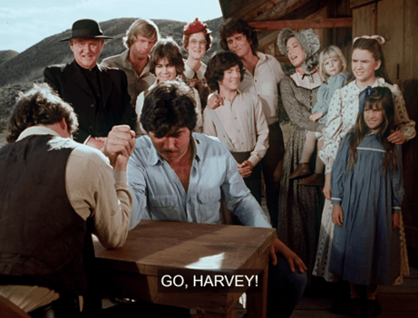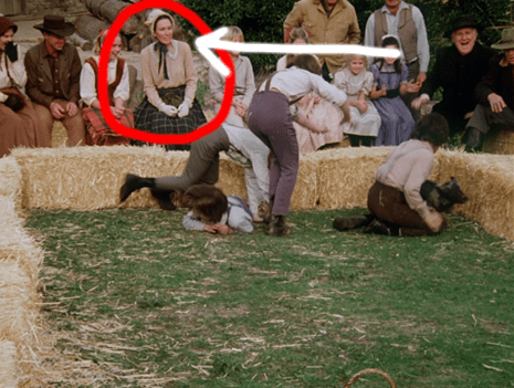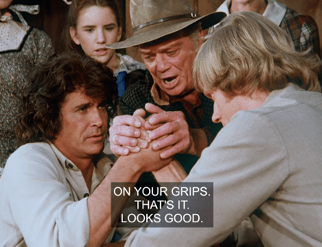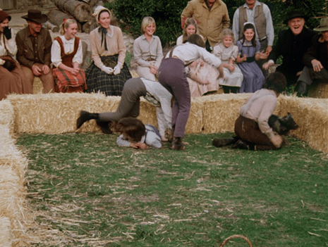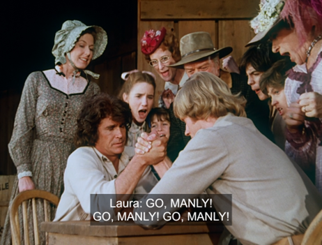 Back at the arm-wrestling, Pa and Almanzo’s match is being officiated not by Doc, but by another old friend, Hans “Rubberface” Dorfler!
