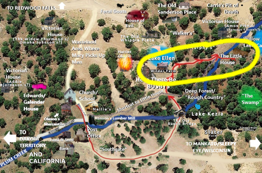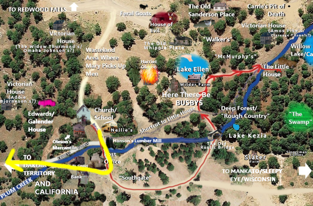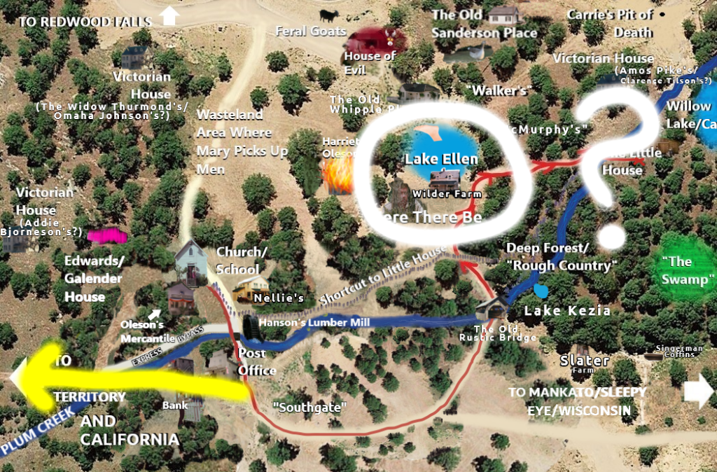 They pass some random horsepens and (I think) Old Man Brower’s place, which we had previously placed near Lake Ellen, the opposite direction from town. But never mind that.